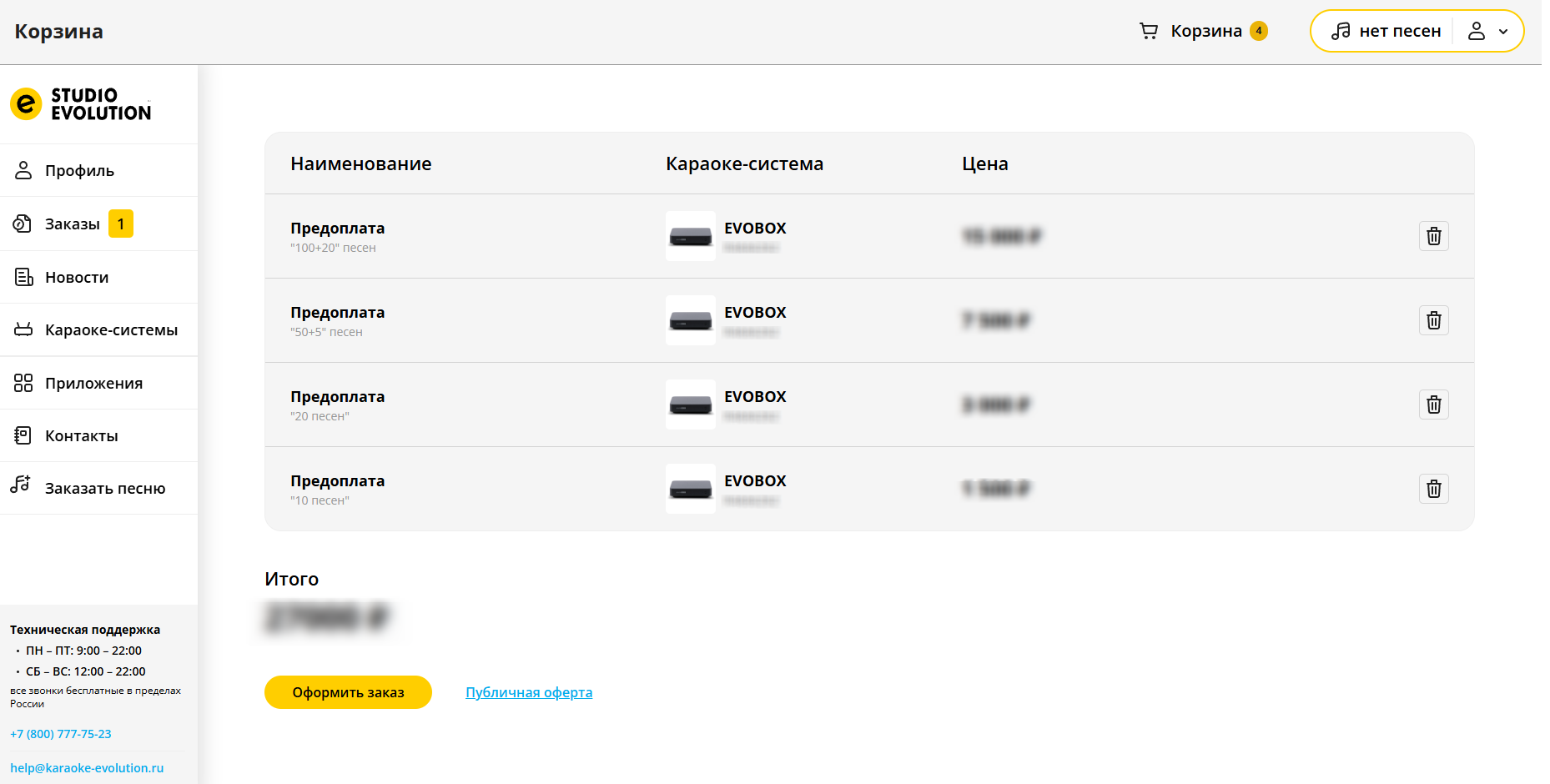 - Корзина: Теперь в неё можно добавлять песни, пакеты и другие продукты для разных систем, а затем оформлять один общий заказ в удобное время. Исключение составляют специальные предложения (пакеты на год, «Вчерашний», «Клубный» и другие), которые оформляются мгновенно.