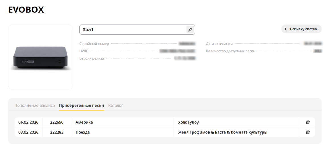 - Журнал покупок (EVOBOX): Весь архив приобретённых песен теперь всегда под рукой в удобном журнале.